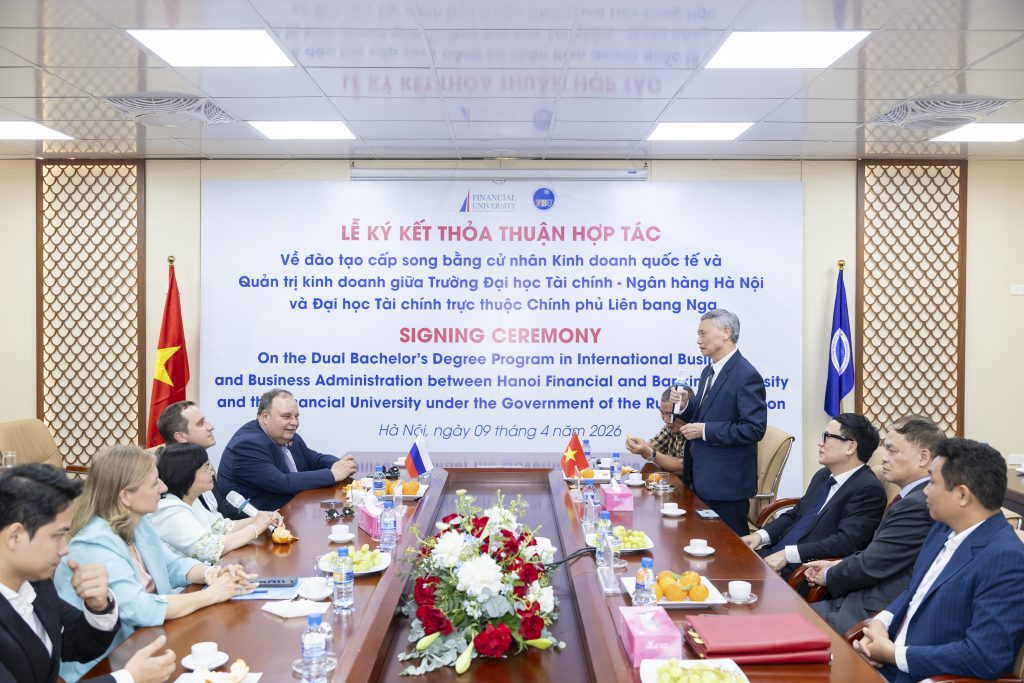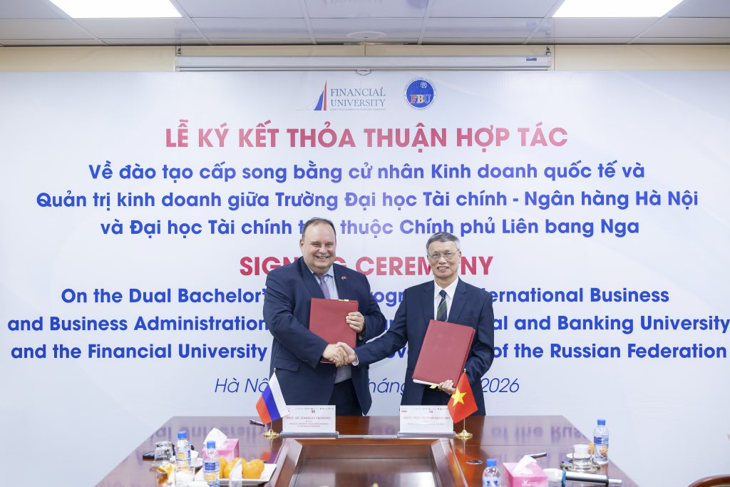 Trong không khí trang trọng và cởi mở, lễ ký kết thỏa thuận hợp tác đào tạo cấp song bằng giữa Trường Đại học Tài chính – Ngân hàng Hà Nội (FBU) và Đại học Tài chính trực thuộc Chính phủ Liên bang Nga đã chính thức diễn ra vào chiều ngày 09/04/2026, đánh dấu một bước tiến quan trọng trong chiến lược quốc tế hóa giáo dục của nhà trường.