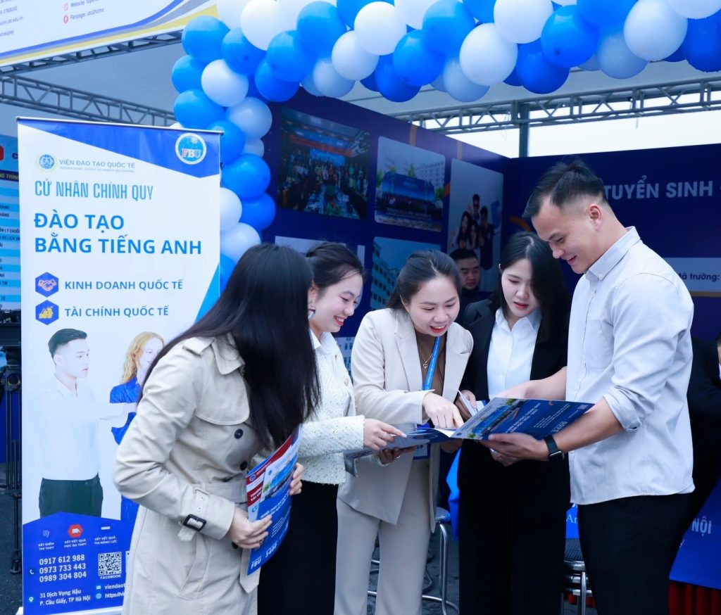 Tại gian tư vấn của Viện Đào tạo Quốc tế, các bạn học sinh được đội ngũ cán bộ tư vấn tuyển sinh cung cấp nhiều thông tin thiết thực và cập nhật, bao gồm: tư vấn lựa chọn ngành nghề phù hợp với năng lực cá nhân và xu hướng việc làm, giới thiệu các chương trình đào tạo theo định hướng quốc tế, thông tin chi tiết về học phí, chính sách học bổng, cũng như lộ trình học tập rõ ràng và định hướng nghề nghiệp thực tế cho kỳ tuyển sinh năm 2026.